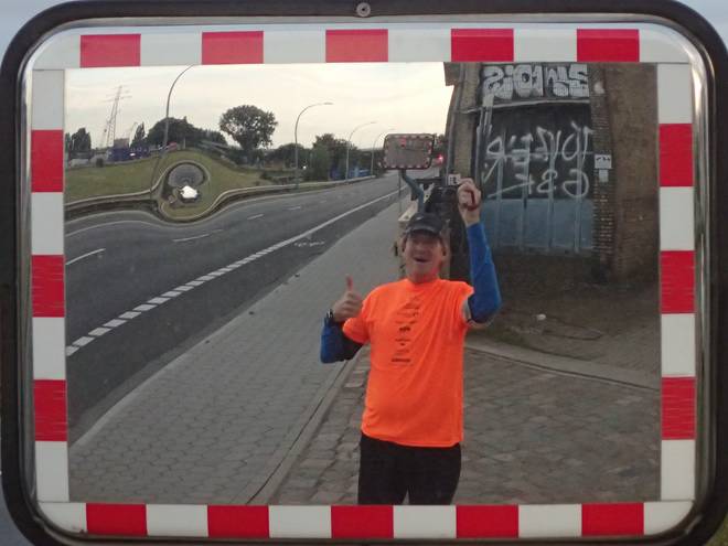 Reiherdamm Runde 5 4.48 Uhr / Km 14,551 Nach 4:32 Minuten für den Auftakt lief ich dann 21:13, 19:32, 19:38, 18:45 und 18:38 Minuten für meine Runden 1 bis 5. Die Runden 1 und 3 jeweils mit Pinkelpause, Runde 4 mit der ersten Trinkpause. Es gab ja keinen Verpflegungsstand im eigentlichen Sinne, wobei ja Odo's Kaffeeklappe alles im Angebot hatte. Ich hatte aber Getränke hinter Christines Auto gebunkert. |