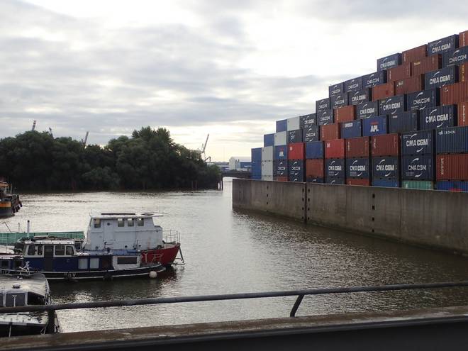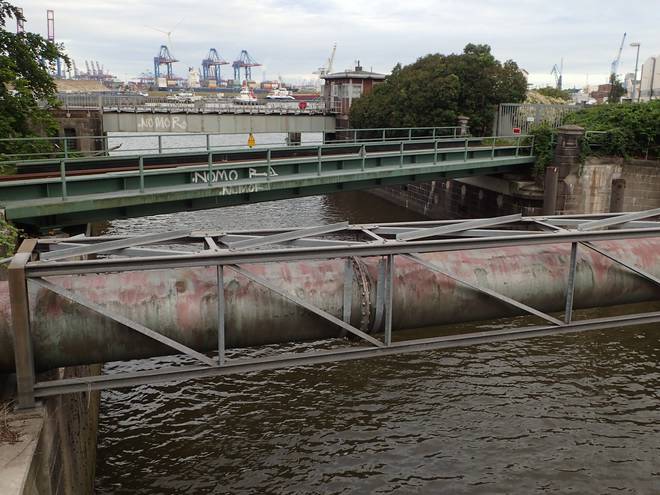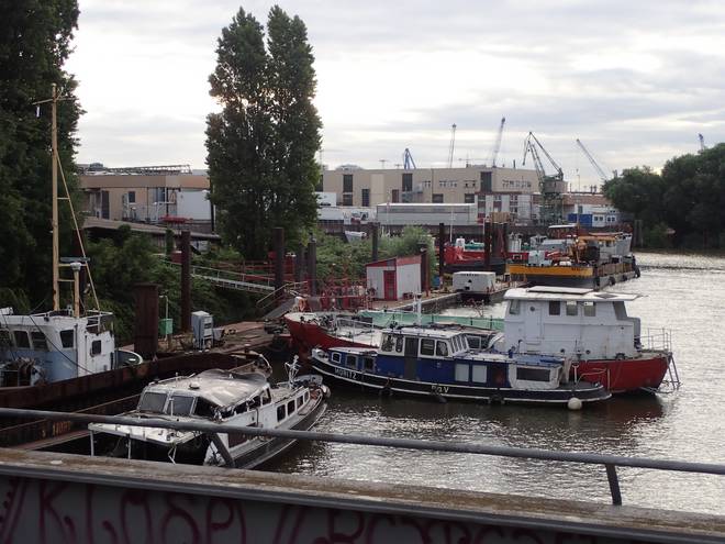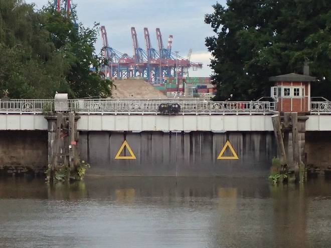 Reiherdamm Runde 13 7.15 Uhr / Km 36,6 Der Blick von oberhalb der Grevenhofschleuse Richtung des Kuhwerder Hafen sowie den Kränen des Container Terminal Burchardkai. |