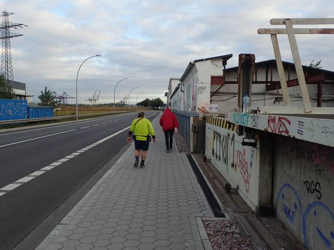 Reiherdamm Runde 7 5.23 Uhr / Km 19,8 Ich brauchte meine Tasche, die ich in ihrem Auto lag. Anfangs wollte ich meine Sachen nicht unbewacht im Hafen herum liegen lassen, aber das schien doch sicher zu sein. Nun wollte ich aber vor allem an meine Jacke heran. Mit der würde es mir auch beim Gehen nicht zu kalt werden. Auch war noch Regen angekündigt. Bei Regen und Gehen ohne Jacke würde ich erfrieren. |