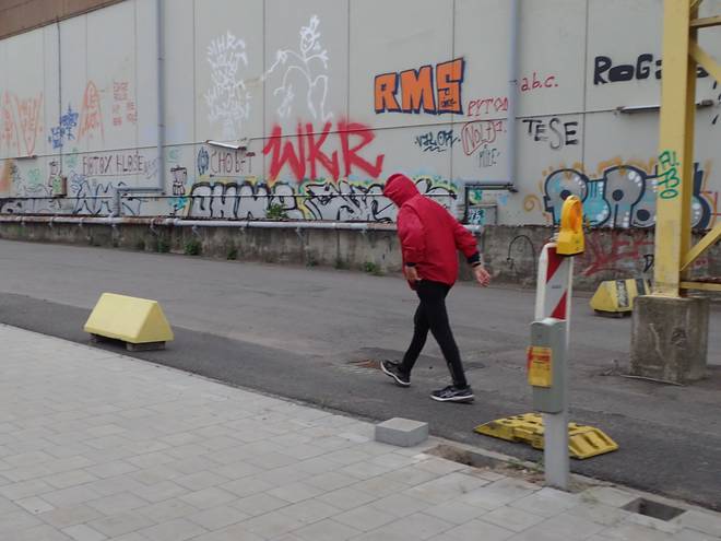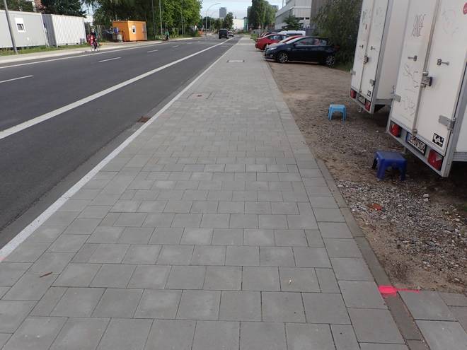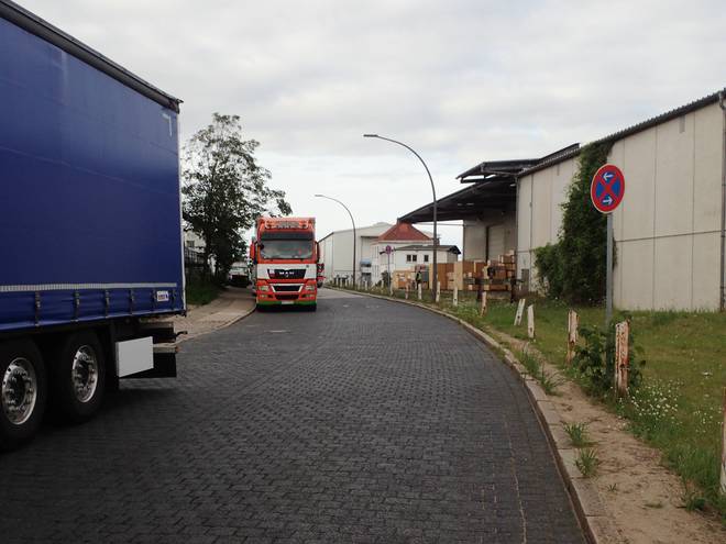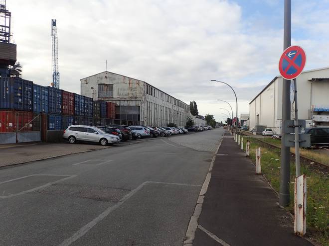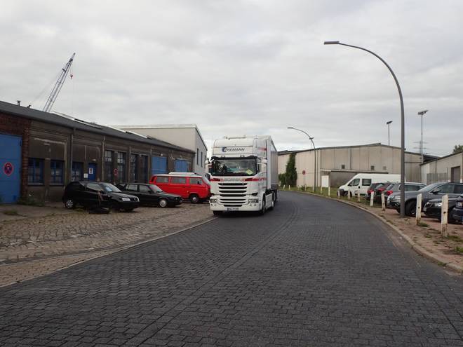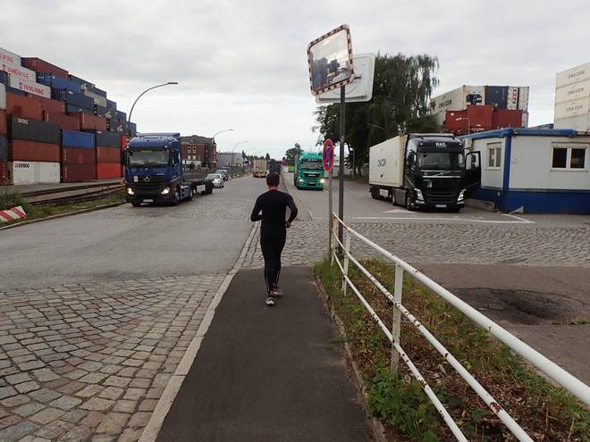 Ellerholzdamm Runde 1 3.19 Uhr / Km 1,7 Aber von der Hauptstraßen abgesehen ist der Hafen kein Fußgängergebiet. So mußte man sich überlegen, wo man zwischen geparkten LKWs und Kopfsteinpflaster am besten laufen konnte. |