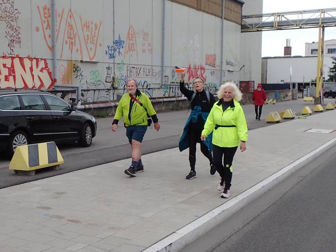 Reiherdamm Runde 12 6.56 Uhr / Km 33,8 So viele Teilnehmer auf einem Foto zu versammeln gelang mir nach dem Auftaktstück nur noch hier einmal. Wobei es nur drei "echte" Teilnehmer sind. Cornelia tauchte erst gegen 6.00 Uhr auf und wanderte außer Konkurrenz mit. Sie hatte daher die größten Energie-Reserven für ihre Rassel. |