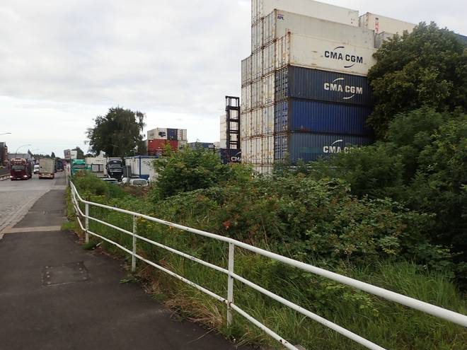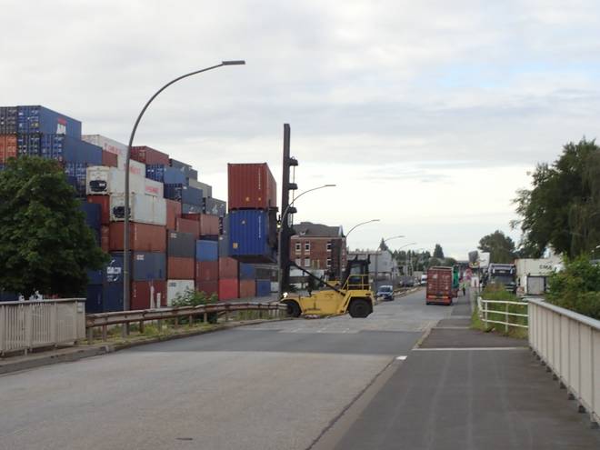 Ellerholzdamm Runde 11 6.49 Uhr / Km 32,6 Natürlich nahm ich mir auch weiter die Zeit für Fotos. Hier das Container-Lager am Grevenhofkanal. |