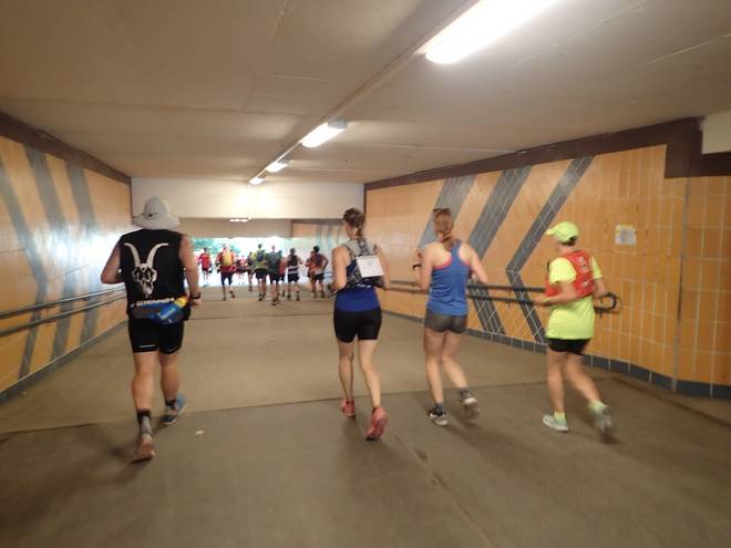 Am Bahndamm 10.10 Uhr / Km 9,15 1:04:03 Stunden hatte ich bis hierher benötigt. Genau 7:00 Min/Km. Wirklich glücklich sah ich nicht aus. Das Scheißwetter, das Gedrängel, das Hörbuch wurde immer absurder. (Foto und rechts im Bild: Rob Deafrunner) |