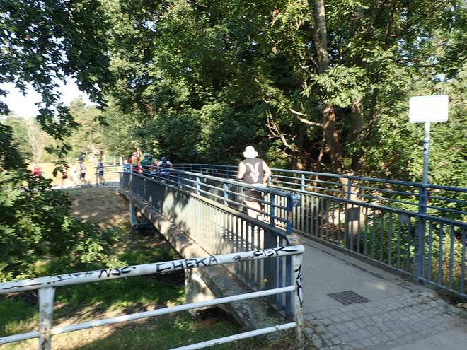 Birnbaumer Straße Wuhletal Wanderweg 10.06 Uhr / Km 8,6 Hätte ich die Strecke gekannt, hätte ich die Brücken zählen können und gewußt, wann der Verpflegungsstand kam. Die offizielle Aussage "ca. 10 km" war etwas wage, wenn man durstig war. |