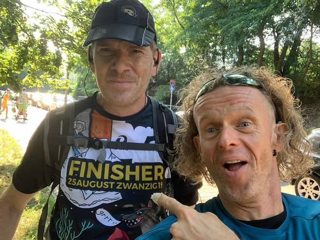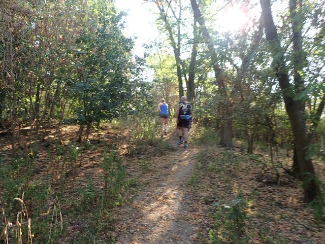Dramburger Straße Wuhletal Wanderweg 9.39 Uhr / Km 4,7 Vorne der Veranstaltungs- Photograf und dahinter der Chef vom dem Ganzen hier. Am Abstieg von der Bisdorfer Höhe war er noch vor mir. Wann habe ich ihn überholt? |