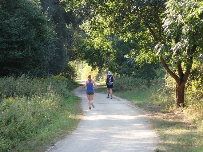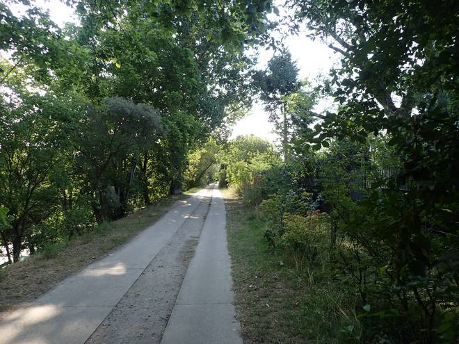 Görsdorfer Straße Wuhletal Wanderweg 10.03 Uhr / Km 8,2 Eine längere Zeit lief ich im Schatten. Das war schön. Oder zumindest weniger grausam. |