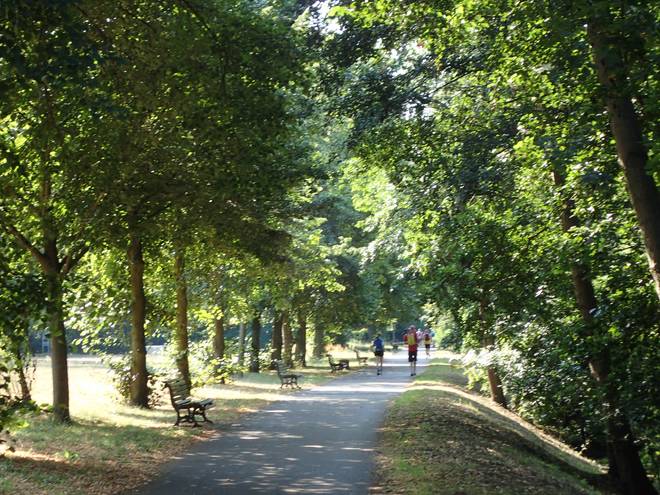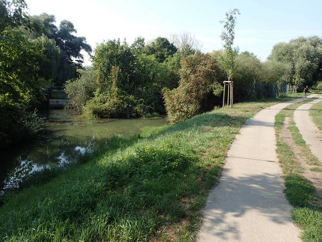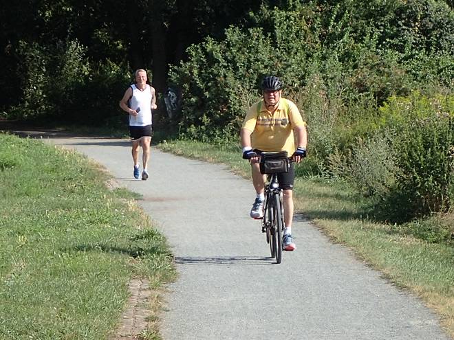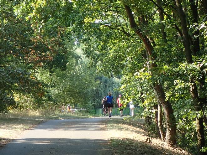 An der Wuhle Wuhletal Wanderweg 9.41 Uhr / Km 5,1 Inzwischen hatte ich ein gutes und ruhiges Tempo gefunden. Damit kam ich voran, aber bei dem Wetter war es schon echt brutal. |
