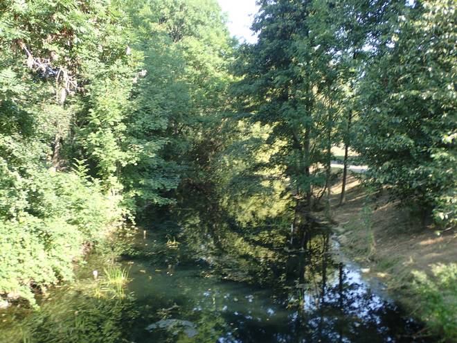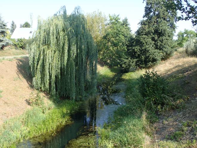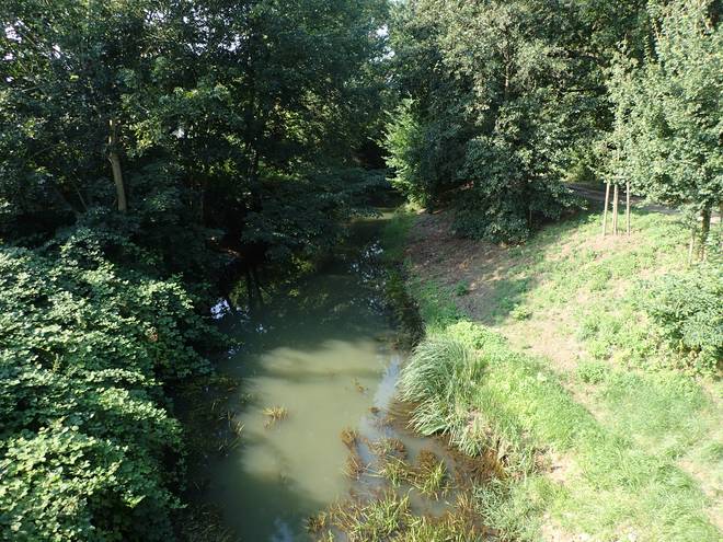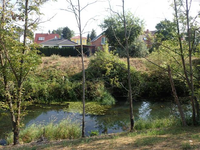 Wuhlesee Wuhletal Wanderweg 9.49 Uhr / Km 6,1 Wobei ich später herausfand, daß der Wuhlesee (teils auch Wuhlebecken genannt) doch viel größer war. Er war aber links hinter den Bäumen gut versteckt. Die Wuhle verlief hier neben dem See. |