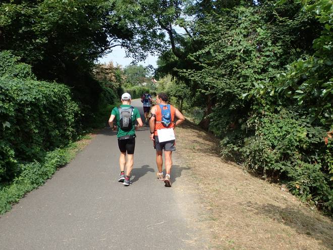 Nitzwalder Straße Wuhletal Wanderweg 12.09 Uhr / Km 24,2 Allmählich machte ich mir so Gedanken übers Aufgeben. Meine Klamotten lagen beim nächsten Verpflegungsstand und der wiederum an einem Bahnhof, von dem aus ich nur eine Haltestelle vom Hotel entfernt war. Verlockend. Aber war es da kühler? Wohl nicht. Diesem Scheiß-Wetter konnte man nicht entkommen. |
