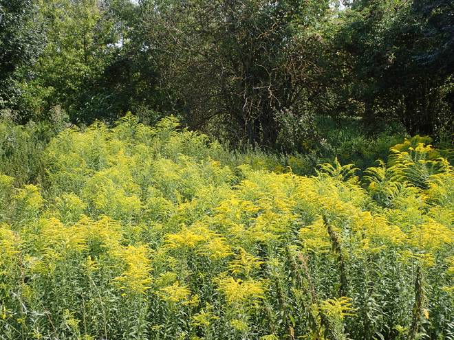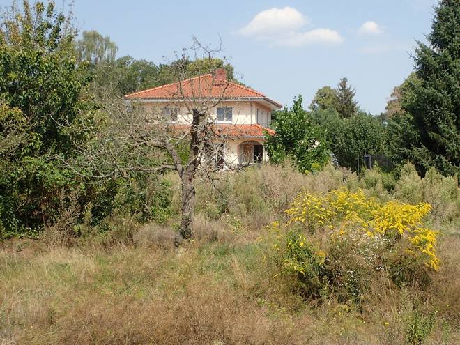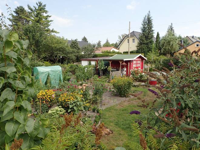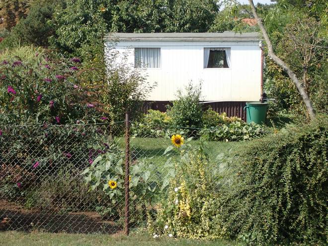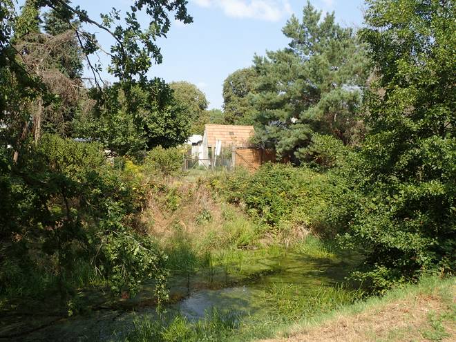 Hadubrandstraße Wuhletal Wanderweg 12.12 Uhr / Km 24,5 Ahhh... Gartenhaus. Das hieß Chance auf Wasser. Aber wie trinkbar ist das Regentonnen-Wasser und wie käme ich an den Sonnenblumen vorbei? |