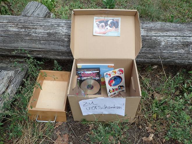 Hoppendorfer Straße Wuhletal Wanderweg 12.02 Uhr / Km 23,4 Auf dem Hinweg hatte ich die "zu verschenken!"-Kiste noch links liegen gelassen, aber nun konnte ich mal einen Blick riskieren. Etwas brauchbares hätte ich die vermutlich fünf Kilometer mitgenommen. Am Verpflegungsstand Drei war auch mein Gepäck. |
