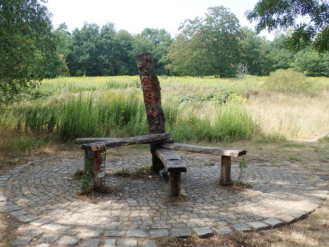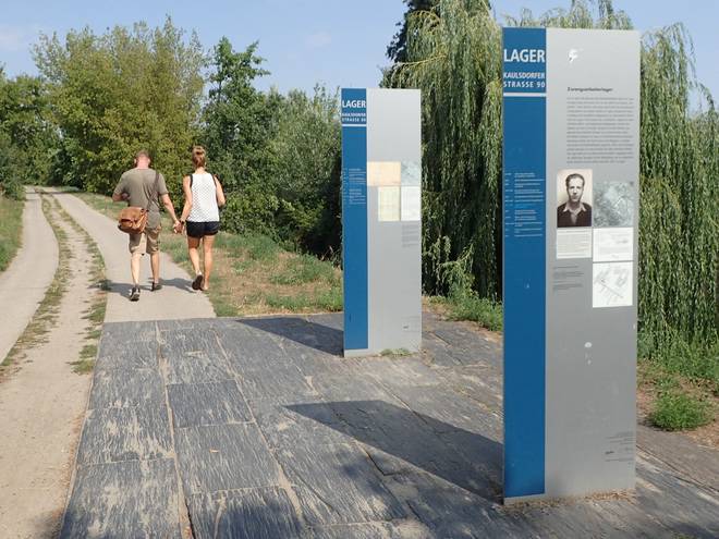 Bismarcksfelder Straße Wuhletal Wanderweg 12.04 Uhr / Km 23,7 Erinnerungsstehlen an ein Zwangsarbeiterlager während des zweiten Weltkrieges. Die hatte ich auf dem Hinweg völlig übersehen. |