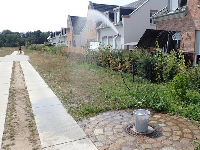 Möwenweg Wuhletal Wanderweg 12.41 Uhr / Km 27,4 Ich glaubte es immer noch nicht. Tatsächlich Wasser. Da hatten Anwohner eine Dusche aufgebaut. Oh wie schön. Da suchte ich 5,8 Kilometer die Umgebung ab und hier gab es Wasser direkt an der Strecke. |