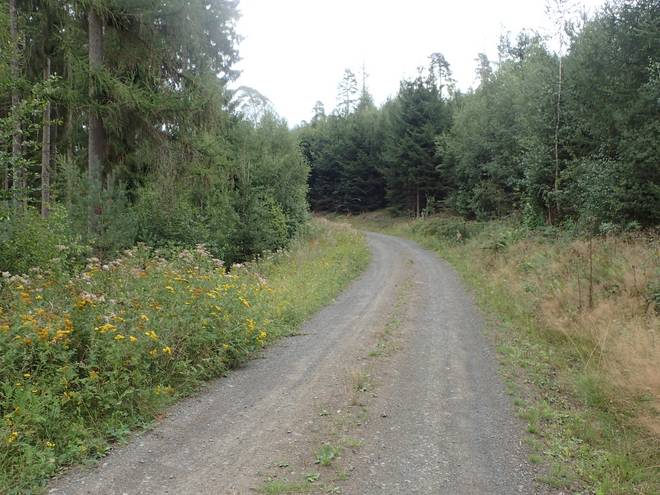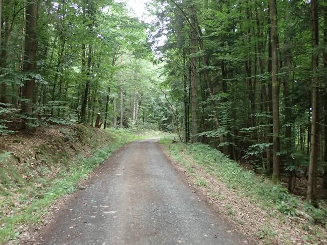 Lärchenweg 13.27 Uhr / Km 30,3 Auch wenn es fast langweilig war, machte ich weiter mit dem Wandern und Laufen im steten Wechsel. Wobei es hier eher bergab als bergan ging. Das wurde zum Problem. |