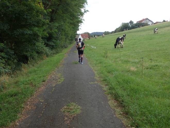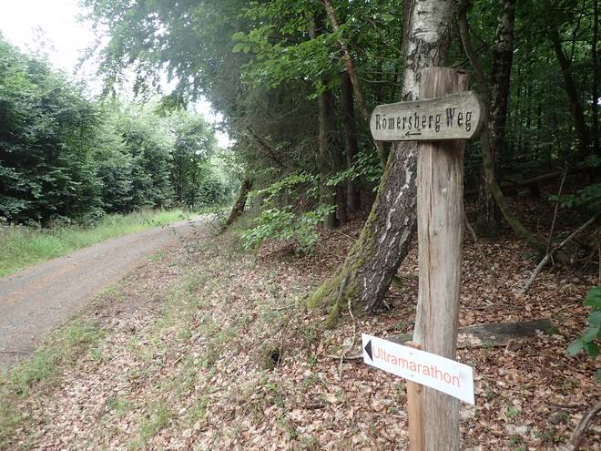 Römersbergweg 13.33 Uhr / Km 31,1 Das vermehrte Bergab sorgte für längere Lauf-Passage und das machte es schwieriger, meinem Kurs zu folgen, nur Anstiege zu wandern, aber es ging noch. |