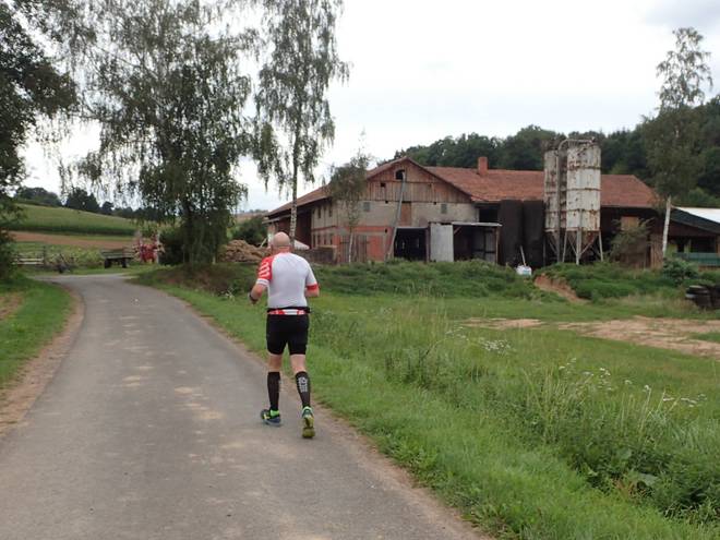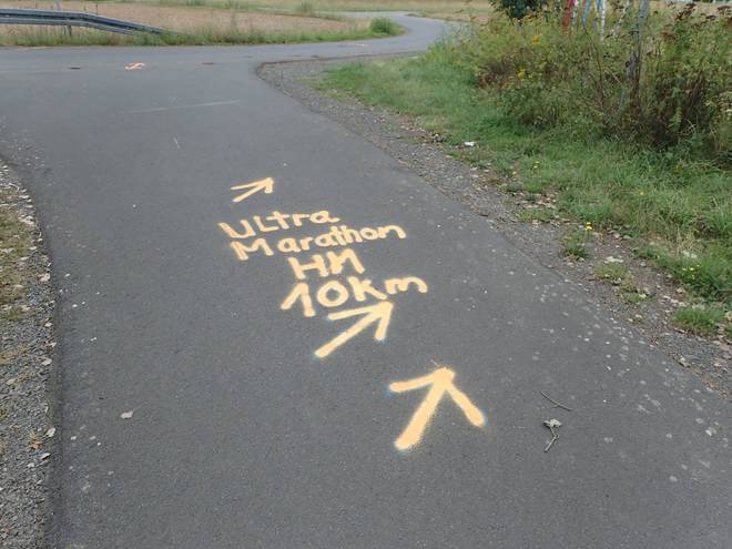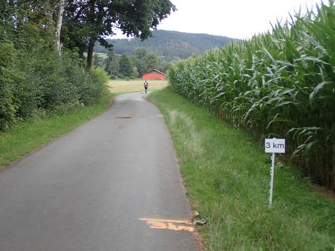 Halsdorfer Straße Wohra 14.05 Uhr / Km 35,5 Ich lief ja öfter mal Marathon an einer Hauptstraße entlang, aber wenn man stundenlang durch Wald und Wiese rannte, dann ist das doch eine gewisse Umstellung. |