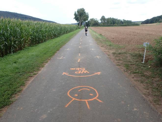 Am Schwimmbad Rauschenberg 14.42 Uhr / Km 42,15 Zuschauer gab es keine und ab hier vorne gab es (offiziell) Maskenpflicht, aber egal. Ich setzte das Ding auf, wollte ja keinen Ärger riskieren, falls Behördenspione da wären. |