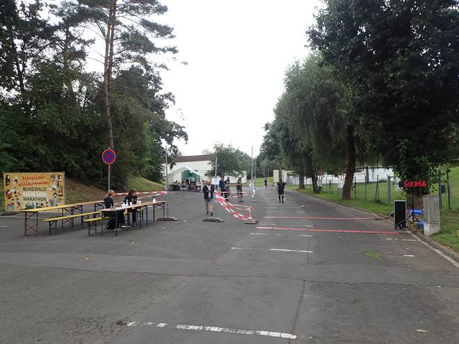 Lärchenweg 13.18 Uhr / Km 29,1 Die Halbmarathon-Läufer folgten dem Marathon-Kurs vom Start bis hin zum ersten Verpflegungsstand, ließen den Abstecher in den Burgwald komplett aus und nahmen ab hier einen eigenen Weg. |