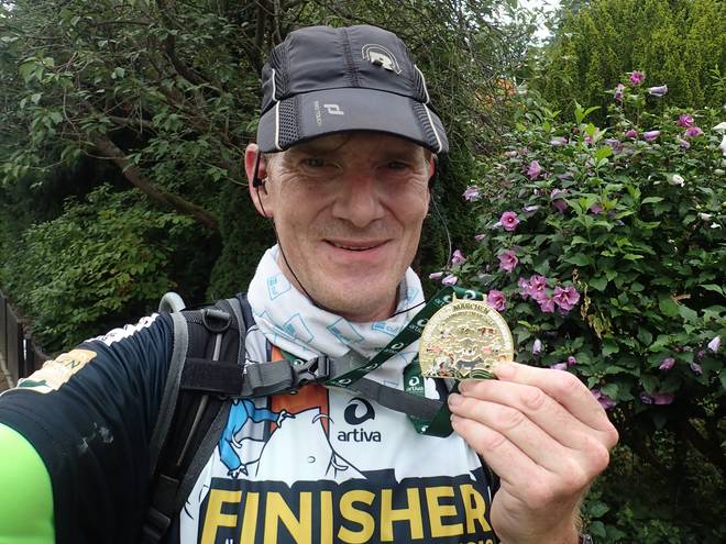 Am Schwimmbad Rauschenberg 14.45 Uhr / Km 42,195 Endlich hatte ich mir meine Medaille verdient, die ich ja über die komplette Strecke geschleppt hatte. 5:25:07 Stunden hatte es nur gedauert. Das war deutlich schneller als die lange Zeit kalkulierten 5:45 Stunden. Dank einer mehr als 19 Minuten schnelleren zweiten Hälfte. |