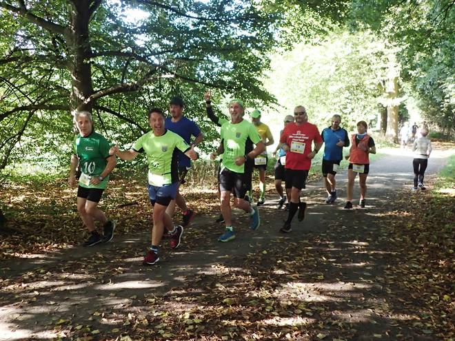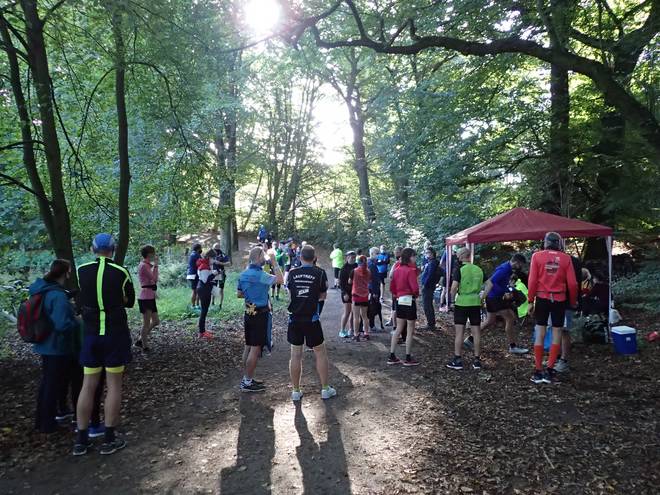 Volksdorfer Teichwiesen 9.05 Uhr Dann wurde es Zeit für den Start. Die Jubiläen mußte ja noch gelaufen werden. Alle 52 angemeldeten Läufer waren am Start. Das kommt nicht so oft vor. |