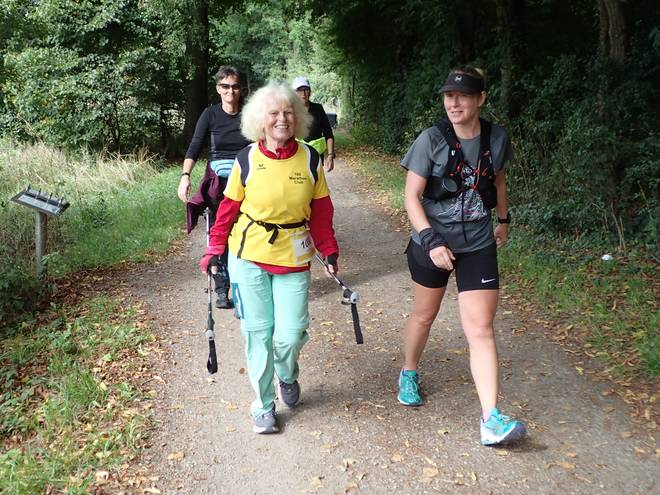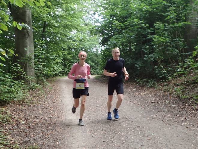 Volksdorfer Teichwiesen 14.06 Uhr Als erste Jubilarin kam dann Madeleine ins Ziel. Offenbar hatte sie Burkhard auf den letzten zwei Runden mit Ihrem typischen Schlußspurt noch abgehängt. |