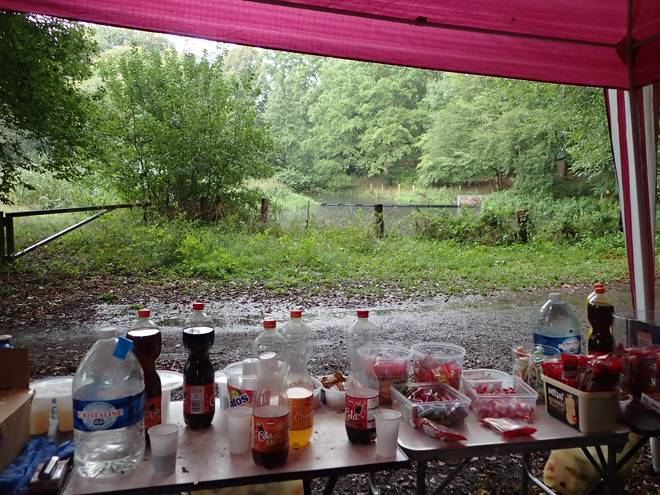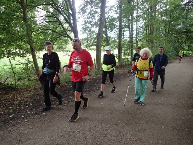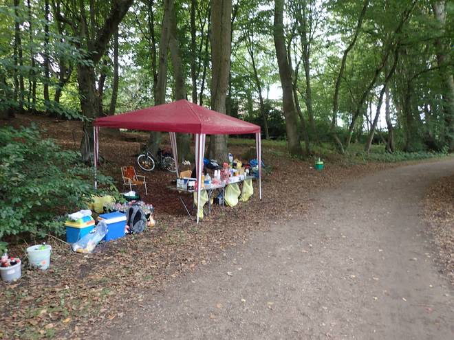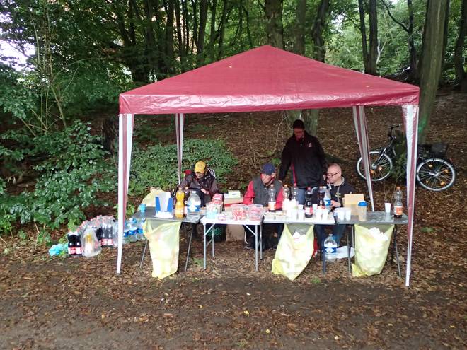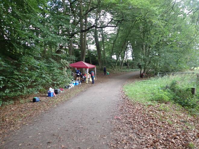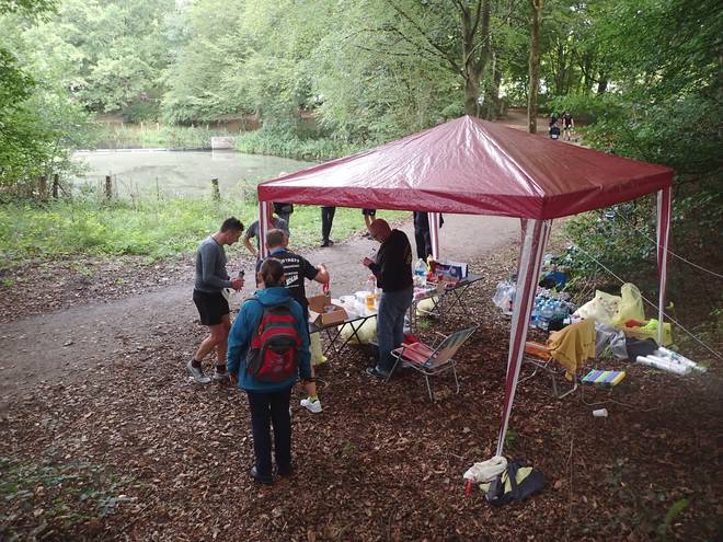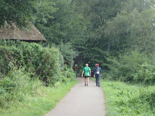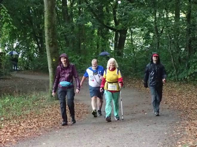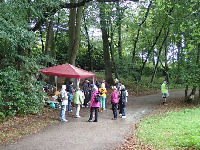 Volksdorfer Teichwiesen 15.49 Uhr Während wir Wartenden am Ziel den Pavillon als Schutz hatten, erging es Christine und ihren Begleitern nicht ganz so gut. Aber sie hatten nur noch eine Runde vor sich. |