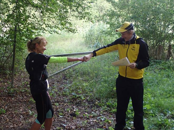 Volksdorfer Teichwiesen 14.09 Uhr Im Ziel stand schon Mario bereit, der 1. Vorsitzende des 100 Marathon-Clubs. Da konnte er die Jubilarin gleich als nun Vollmitglied im Cluc Willkommen heißen. |