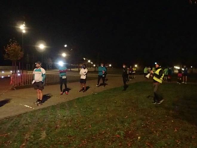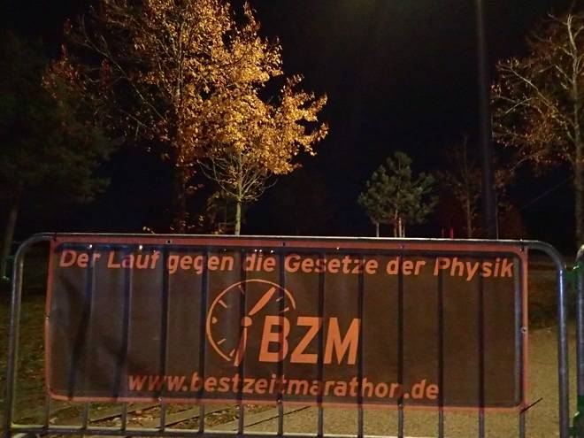 Riemer Park 23.55 Uhr Schließlich ging es zum Start. Immer schön mit Abstand. Zunächst starteten nur die 56 Marathon-Läufer und die 12 Viertelmarathon-Läufer. Die Halbmarathon-Läufer (58) starteten um 2.00 Uhr (nach Sommerzeit). |