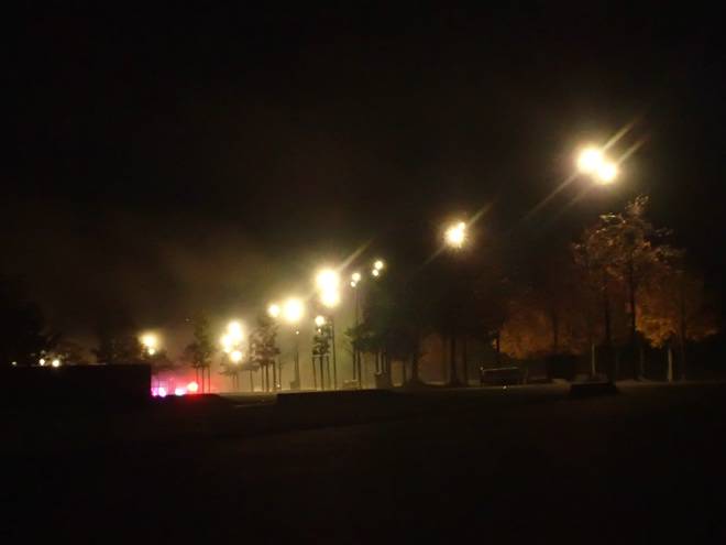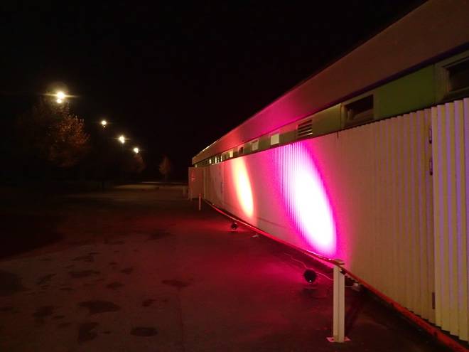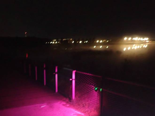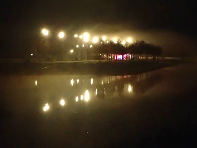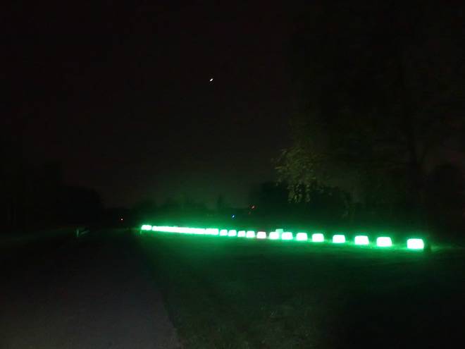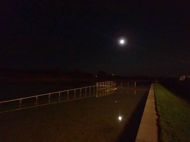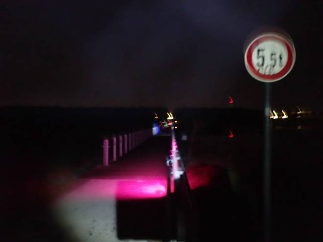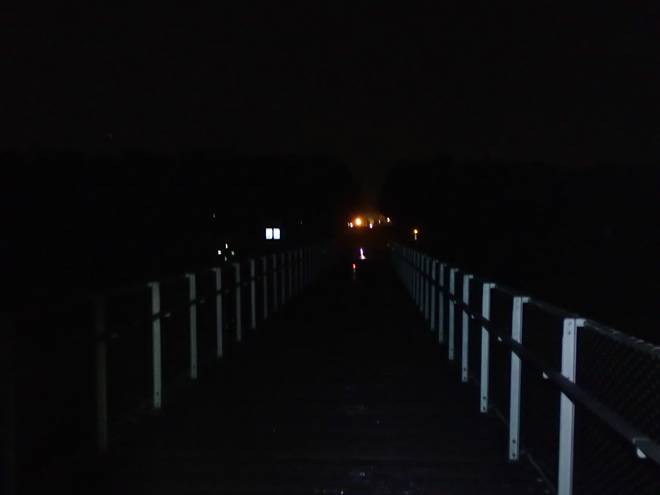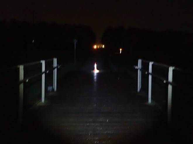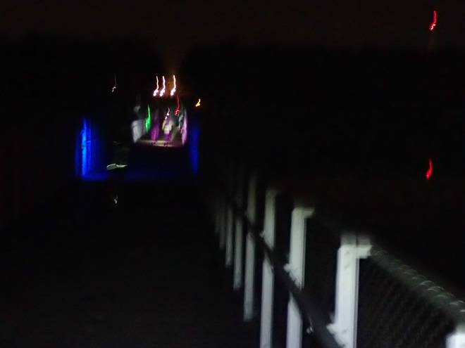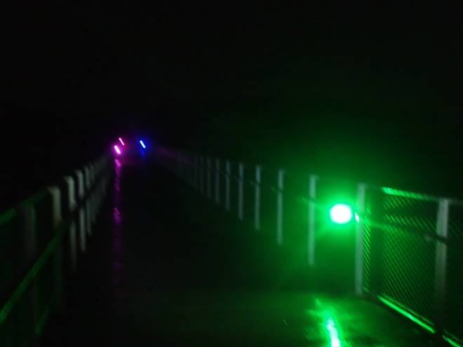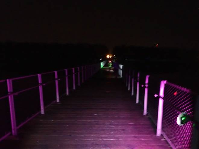 Runde 3 0.42 Uhr (MESZ) / Km 5,5 Interessant war allenfalls der Steg über den See. Da gab es zwar auch nichts zu sehen, die bunte Beleuchtung hatte was. Zudem waren die Holzbohlen oder -planken leicht rutschig. |