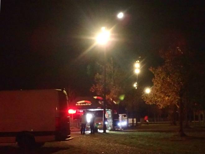Riemer Park 22.47 Uhr 5° bis 6°C, ein sternenklarer Himmel, nahezu windstill mit einer irren Luftfeuchtigkeit. Die Papierunterlagen lösten sich buchstäblich auf und alle Klamotten waren schon jetzt klatschnaß. Im Süden ist immer solch ein seltsames Wetter. |