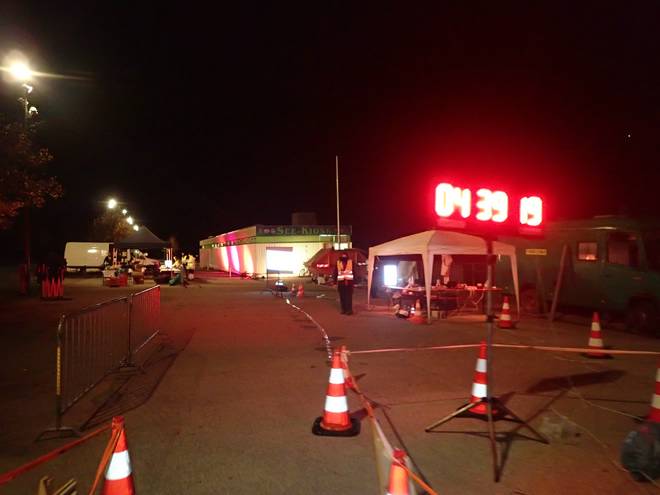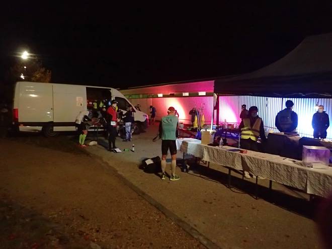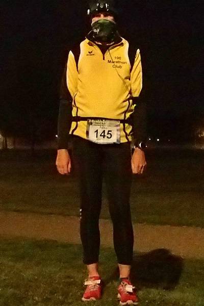 Runde 1 0.02 Uhr (MESZ) / Km 0,2 Die Maske konnte man hinter dem Veranstaltungsgelände abnehmen. Das war gleich die erste Pause, denn irgendwo mußte die ja hin. |