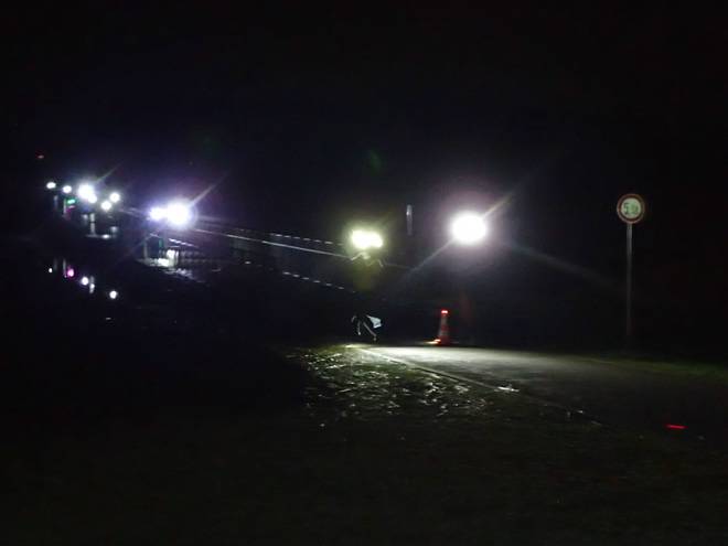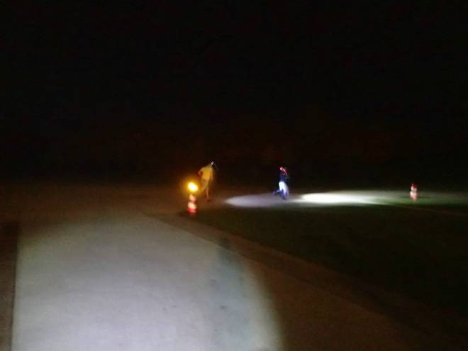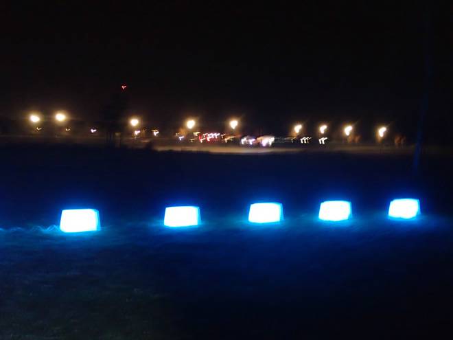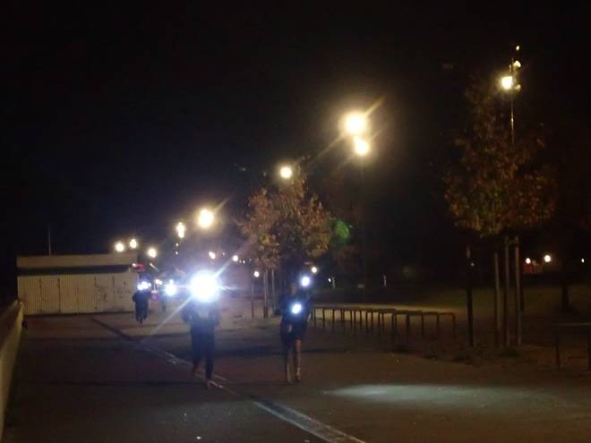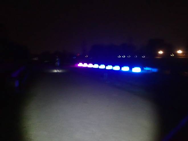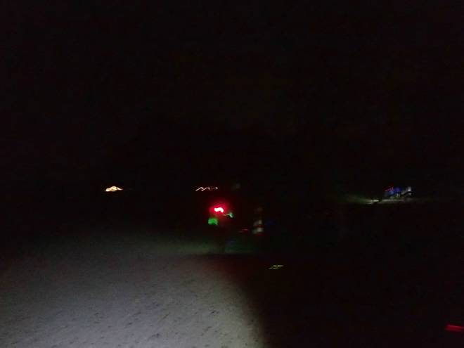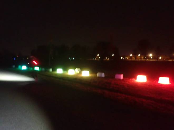 Runde 1 0.07 Uhr (MESZ) / Km 0,8 Der Großteil der Runde war unbeleuchtet. Die Mitnahme einer Stirnlampe war nicht nur verpflichtend, sondern auch sinnvoll. Die Strecke konnte man aber gut finden. Die Abzweigungen waren mit Warnblinkern gut markiert und die Wege waren mit reflektierenden Streifen versehen. Und die weithin sichtbaren Stirnlampen der Mitläufer gab es auch noch. |