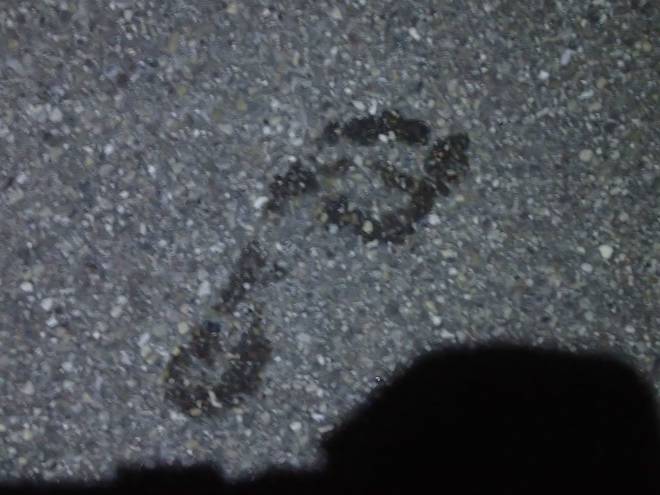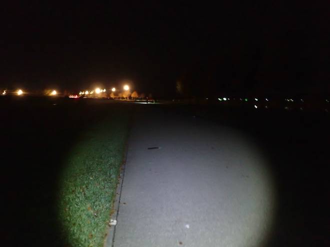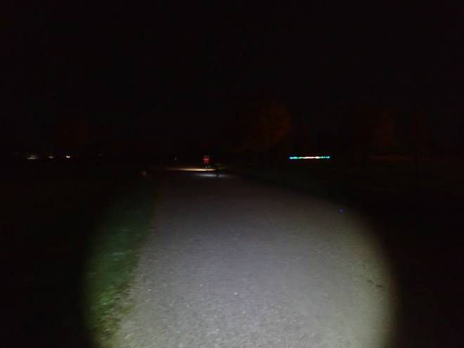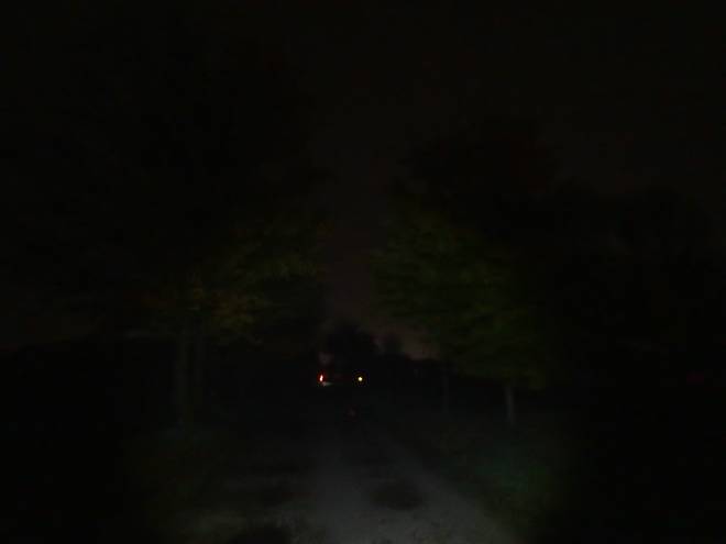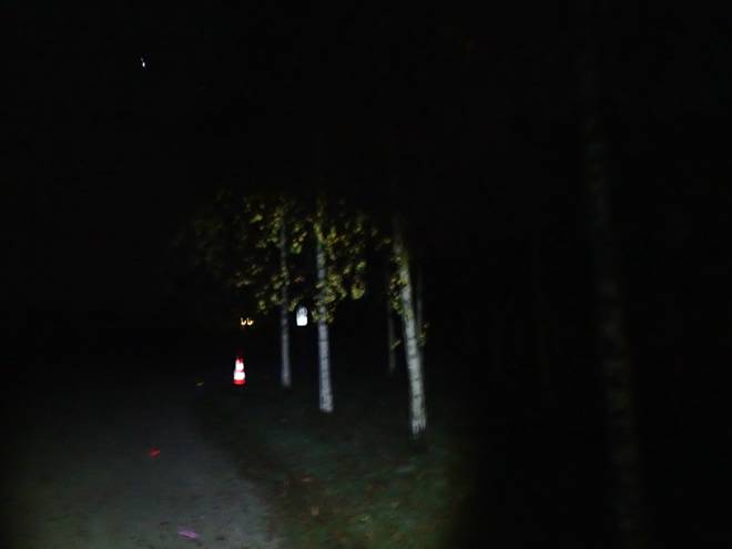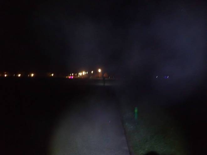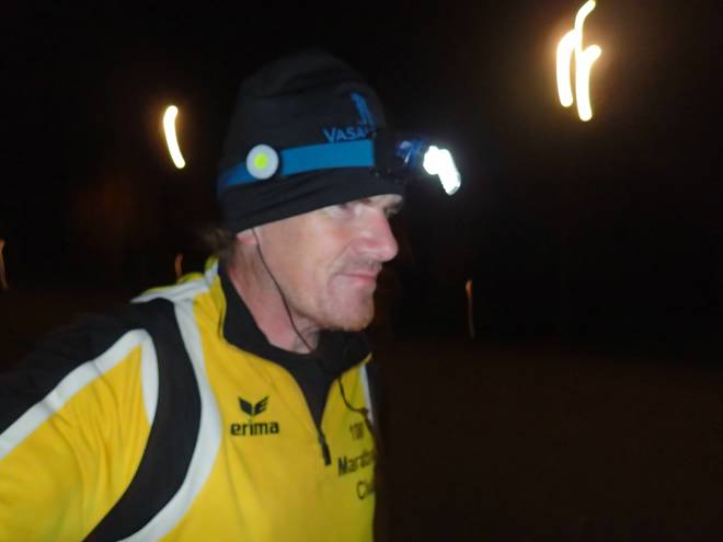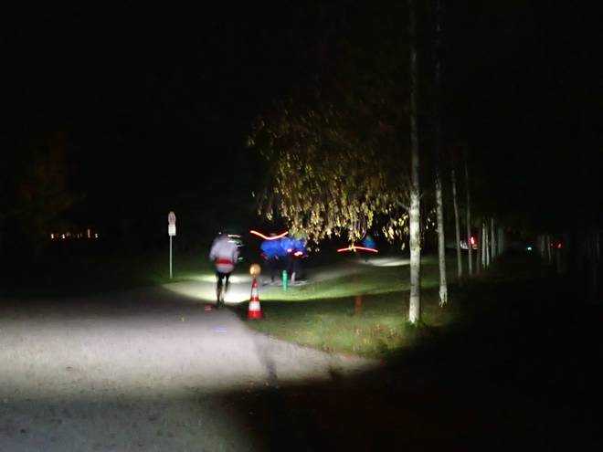 Runde 2 0.30 Uhr (MESZ) / Km 3,7 Läuferisch war es leicht. Die Strecke war gut zu laufen und flach. Schwierig war hingegen, daß es absolut gar nichts zu sehen gab und man immer nur in den Lichtkegel vor einem starrte. Für sich betrachtet ist das etwas Besonders, aber auf Dauer extrem eintönig. |