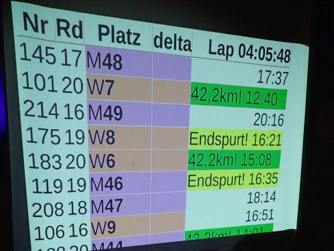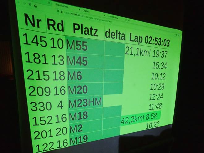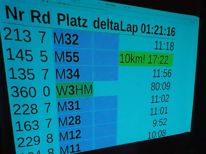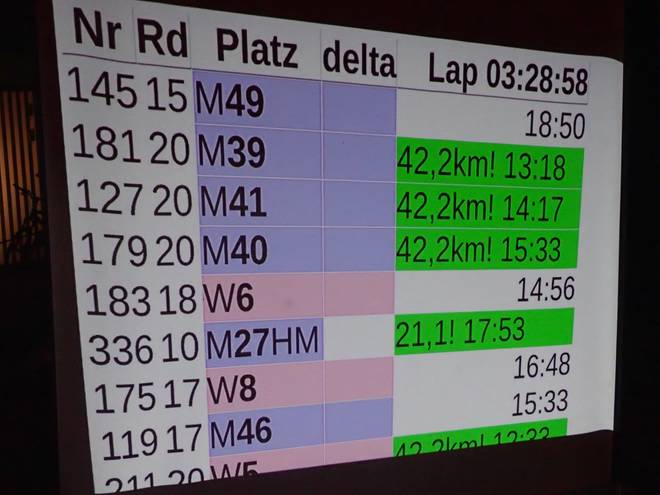 Runde 5 1.21 Uhr (MESZ) / Km 10,55 1:18:25 Stunden nach fünf von 20 Runden. 17:41 Minuten in Runde 5. Das konnte ja eine lange Nacht werden. |