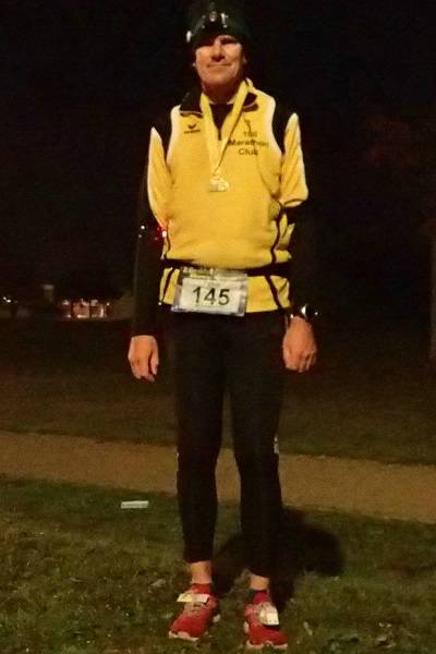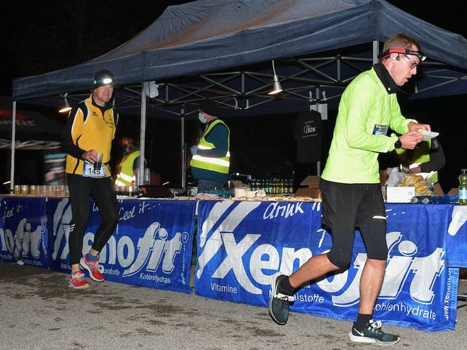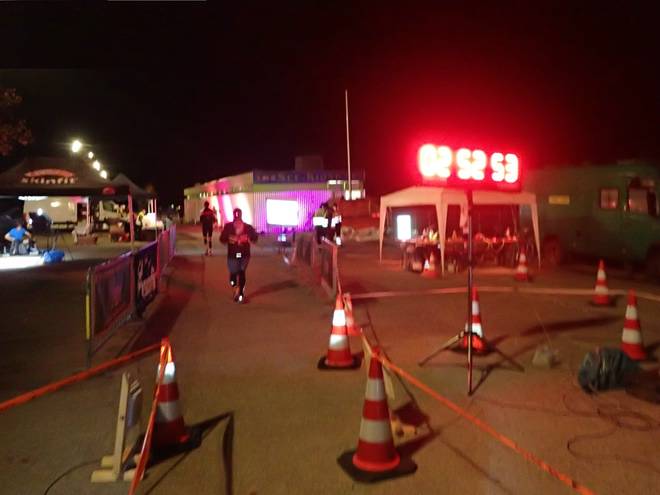 Runde 10 2.33 Uhr (MESZ) / Km 19,0 Getrunken wurde Anfang der Runden 7, 8, 10, 11, 13, 14 und 18. Der Durst zum Ende hin blieb aus. Sonst trinke ich da erst so richtig los. Allerdings zeige die Coca-Cola für mein Tempo keine Wirkung. Aber wenn ich nicht trank, verging das Sodbrennen. Alles sehr seltsam. (Foto vom Veranstalter) |
