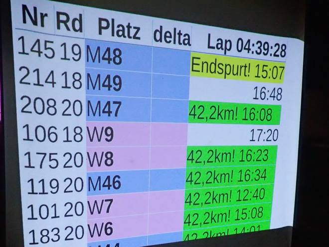 Runde 20 4.39 Uhr (MEZ) / Km 40,1 Hinter mir wurde auch weiter Tempo gemacht, aber nun war ich doch deutlich schneller. |