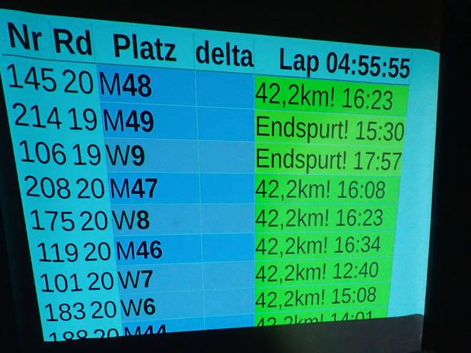 Runde 20 4.39 Uhr (MEZ) / Km 40,2 Zudem hatte ich für ein Unter-Sechs-Stunden-Finsih 23:35 Minuten Zeit. Ich würde es sogar vor 5.00 Uhr ins Ziel schaffen. Dafür reichten 20:40 Minuten. Meine langsamste Runde bis dahin waren 19:49 Minuten. |