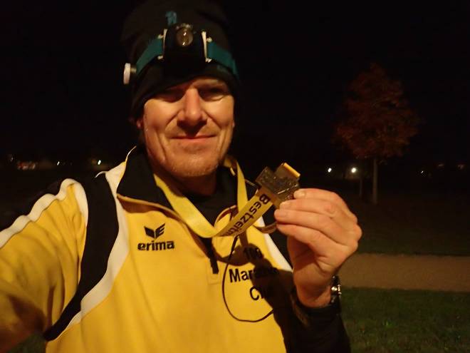 Finish 4.59 Uhr (MEZ) / Km 42,195 Die zwei Teilnehmer nach mir kamen binnen fünf Minuten zum Ziel. Da hatte ich schon meine Medaille abgegolt. Was war meine Marathon-Medaille Nr. 337. |