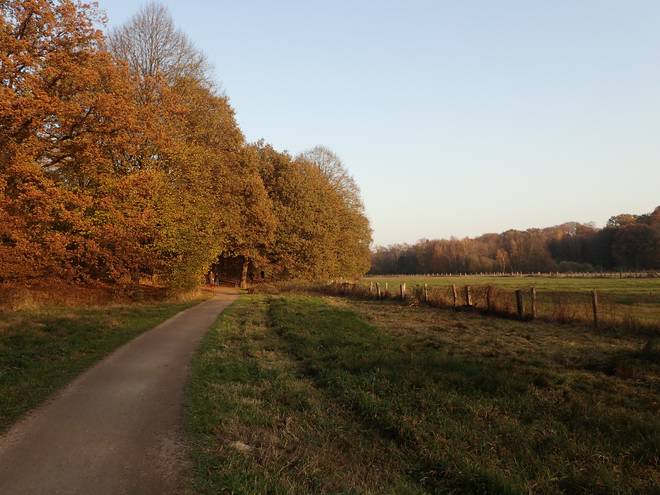 Runde 16 15.37 Uhr / Km 40,4 Ein langer Tag war das. So erlebte ich die Teichwiesen auch bei Sonnenlicht von unterschiedlichen Richtungen. Hier auf der Südseite lag die Strecke schon im Schatten. Der Sonnenuntergang war um 16.32 Uhr. |