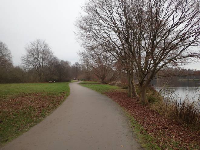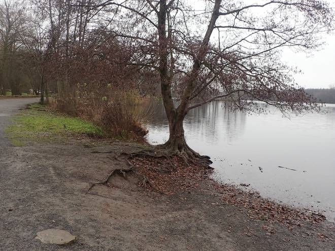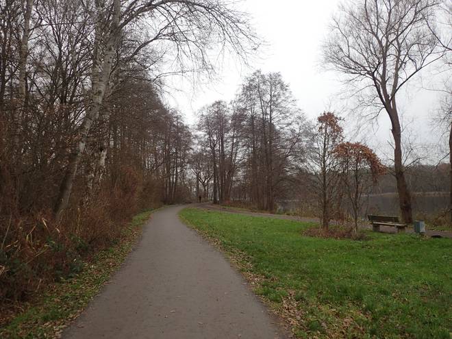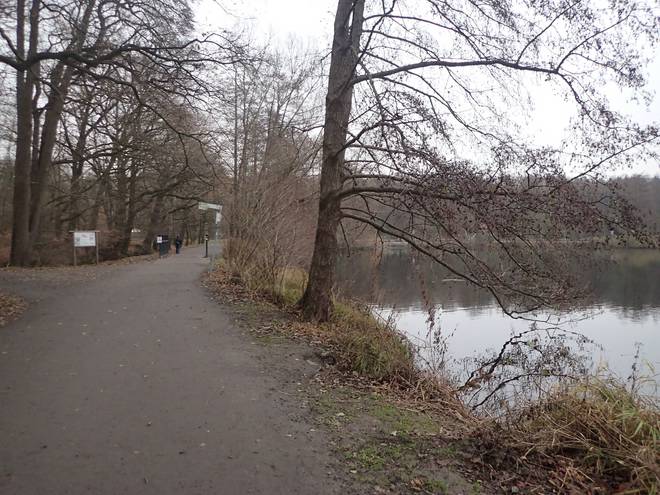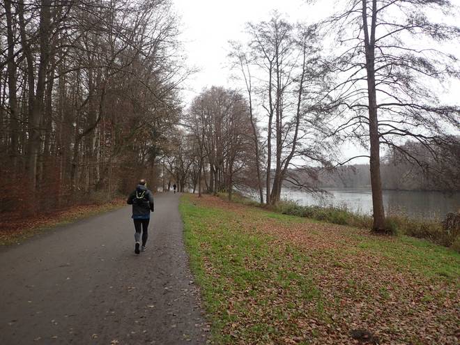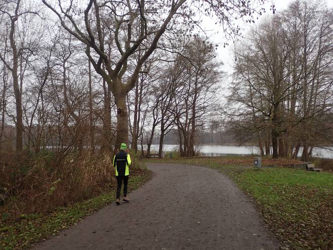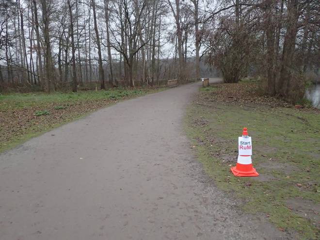 Runde 1 9.01 Uhr / Km 0,05 Die Strecke war wie immer. Zunächst eine Runde nur um den See (3095 Meter), dann sieben Runden um See und südlich angrenzenden Wald (je 5140 Meter) und die letzte Runde wieder nur um den See bis zum Ziel (3020 Meter). |