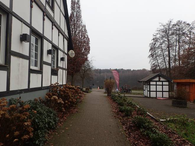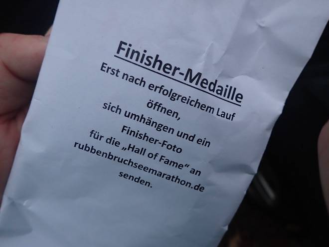 Café am Rubbenbruchsee 8.56 Uhr Die Toiletten im Café standen uns diesmal leider nicht zur Verfügung. Aber Startunterlagen gab es. Eine prall gefüllte Tüte mit Getränken, Obst, Süßkram, Startnummer und Medaille. Den Medaillen-Umschlag ließ ich aber geschlossen. Die hatte ich mir noch nicht verdient. |