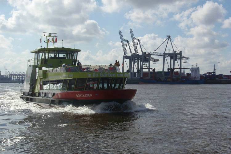HADAG-Fähre vor Övelgönne, dahinter der Hamburger Hafen