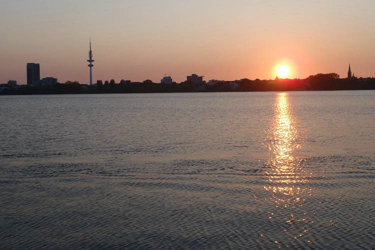 Außenalster bei Sonnenuntergang / Heinrich-Hertz-Turm / St. Johannis Kirche