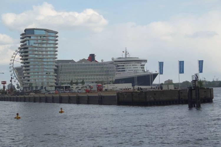 Die "Queen Mary 2" am Cruise Terminal hinter dem Unilever-Haus / Hafen-City