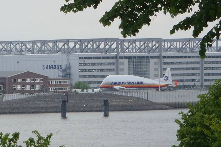 Blick über die Elbe auf die Airbus-Flugzeugwerft Finkenwerder