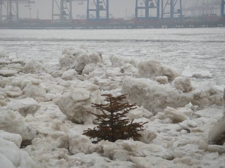 Eisschollen auf der Elbe und am Strand von Övelgönne / Containerhafen