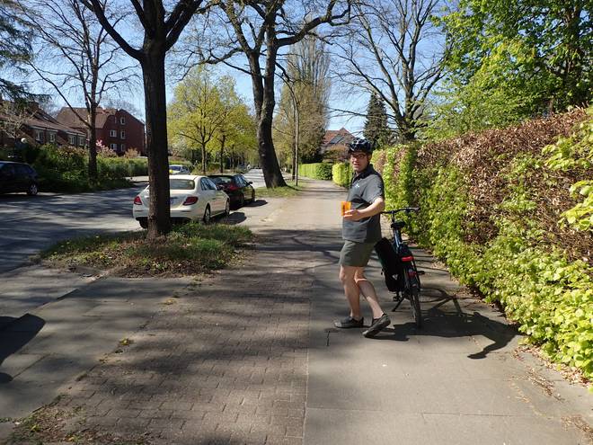 Maienweg Überraschung. Nicht, daß ich vielfach Anfeuerungen von Passanten bekam, hier gab es sogar ein Verpflegung. Es wurden Wasser, Bananen und Schokolade angeboten. Ganz den Corona-Vorschriften wurde der Becher am Boden abgestellt, ich nahm ihn mit, trank, stellte ihn wieder hin. |