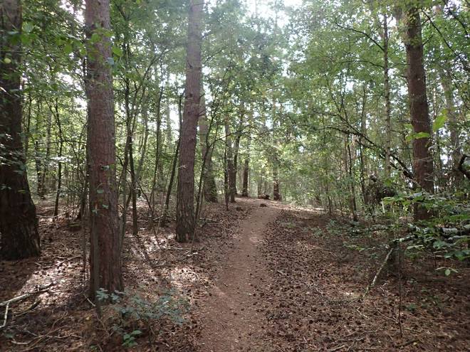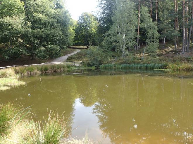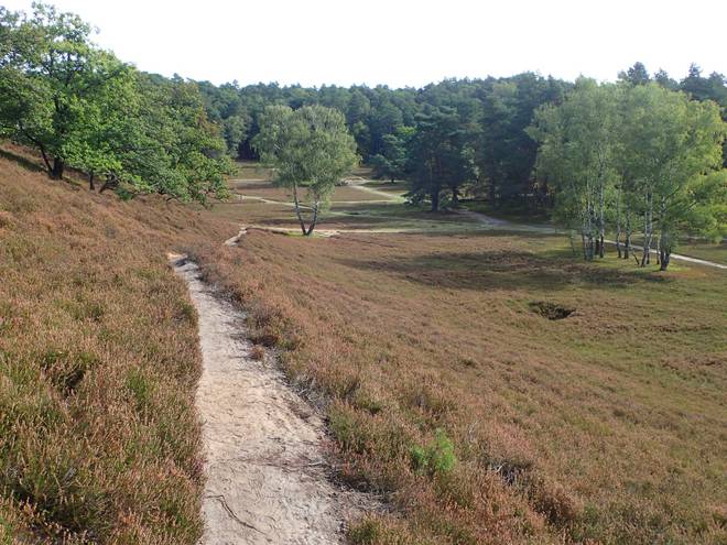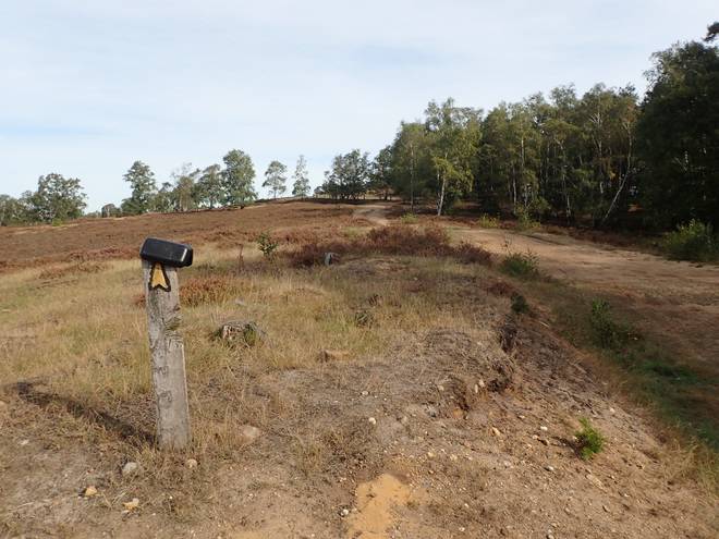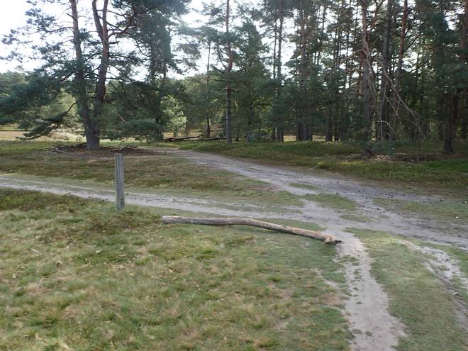 Fischbeker Heide Hier links kann man zu einem Aussichtshügel laufen, aber dahin führt ein steiler Weg. Dort oben war ich aber schon gewesen, brauchte das nicht erneut. |