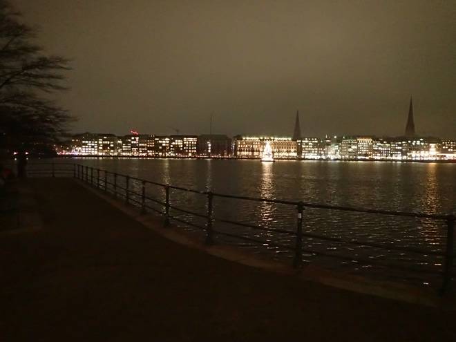 Binnenalster Lombardsbrücke 17.13 Uhr Schon wegen der vielen Nacht-Fotos konnte das Tempo nicht allzu gewesen sein. Aber es macht Spaß und übermäßig anstrengend war es nicht. Dafür bekam ich einiges an Anerkennung von Passanten. Vielen gefiel das auffällige Outfit. |