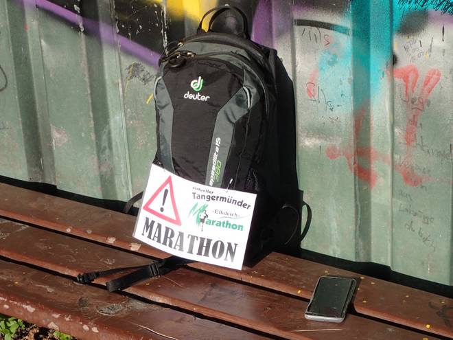 Dove-Elbe Odemann Brücke Einen Marathon alleine zu laufen, war nicht neu für mich. Bei manch kleinerem Event löste ich mich schnell vom Rest des Feldes und lief die Strecke dann alleine. Aber da gab es Verpflegungsstellen und ich mußte nicht auch noch meine Klamotten mitschleppen. |